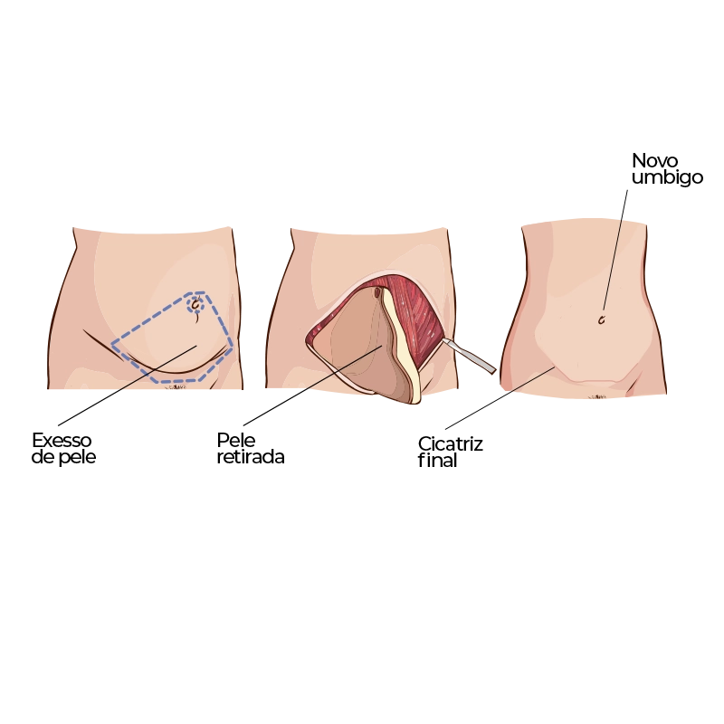 A pele é totalmente descolada da musculatura que esta abaixo, tracionada até o limite inferior e todo excedente é ressecado. O umbigo é reimplantado em outro local na pele.